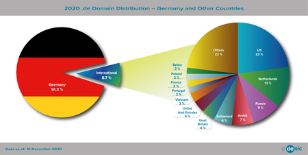 Compared on an annual level, the overall number of .de domains under management increased by 2.3 percent compared to a plus of 0.7 percent in 2018/2019. This is an increase of 376,000 .de domains (2019: +120,000 domains). The more than 16.7 million .de domains that were registered at the end of 2020 included more than 1.45 million domains of holders residing outside of Germany (2019: 1.32 million). With +9.7 percent, the share of these domains increased considerably (2019: +7.9%) and accounted for 8.7 percent of all .de domains at the end of 2020 (2019: +8.1%). The holders of .de domains residing outside of Germany originated from all over the world. As in the past, German domains were particularly popular in the United States (23%), the Netherlands (13%) and in the Russian Federation (9%). Germany's European neighbours Aus-tria and Switzerland also had a 7- and 6-percent share each in the .de domains with non-German-based holders, and Great Britain and the United Arab Emirates accounted for 4 percent each.