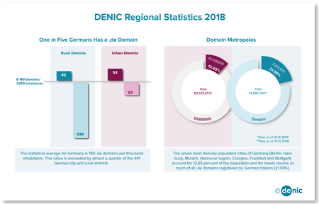 Looking at absolute domain numbers, the top ranks among German cities continued to be held by the metropolitan places: Scoring 1,006,388 .de domains, Berlin stays clearly in the lead, far ahead of Munich (623,494) and Hamburg (577,127) on ranks two and three. When referring the number of .de domains to the number of inhabitants, last year's ranking of the top three in that group also remains unchanged. Osnabruck comes first again: With 1,509 .de domains per 1,000 inhabitants, it still is far ahead of the other two top runners in the city league, Munich (426) and Bonn (388). In regard to the administrative districts, the frontrunners are located in the South of Germany again, namely Bavaria: Freising (435 domains) remains the uncontested number one, preceding the dis-tricts of Starnberg (398) and Munich (366). The national average is 180 .de domains per 1,000 in-habitants (higher individual statistical values reflect local domain investors with larger-scale domain portfolios). About one quarter of the cities and districts included in the analysis exceed the aver-age value, whereby the number of cities (53) with above-average values is considerably higher than the number of districts (42).