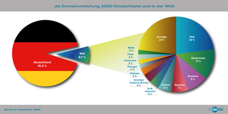 Im Jahresvergleich 2019/2020 stieg der Gesamtdomainbestand um 2,3 Prozent gegenüber 0,7 Prozent im Zeitraum 2018/2019, was einem Wachstum um 376.000 .de-Domains (Vorjahr: 120.000) entspricht. Die mehr als 16,7 Millionen zum Jahresende weltweit registrierten .de-Domains beinhalten 1,45 Millionen Domains von Inhabern mit Wohnsitz im Ausland (Vorjahr: 1,32 Mio.). Ihr Anteil ist um 9,7 Prozent gestiegen (Vorjahr: + 7,9 %) und beträgt nun 8,7 Prozent am gesamten .de-Domainbestand (Vorjahr: 8,1 %). Die ausländischen Inhaber von .de-Domains stammen aus der ganzen Welt. Deutlich am stärksten nachgefragt sind deutsche Domains weiterhin in den USA (23 %), den Niederlanden (13 %) und der Russischen Föderation (9 %). Auf die Nachbarländer Österreich und Schweiz entfallen 7 und 6 Prozent des Domainbestands ausländischer Inhaber sowie je 4 Prozent auf Großbritannien sowie die Vereinigten Arabischen Emirate.