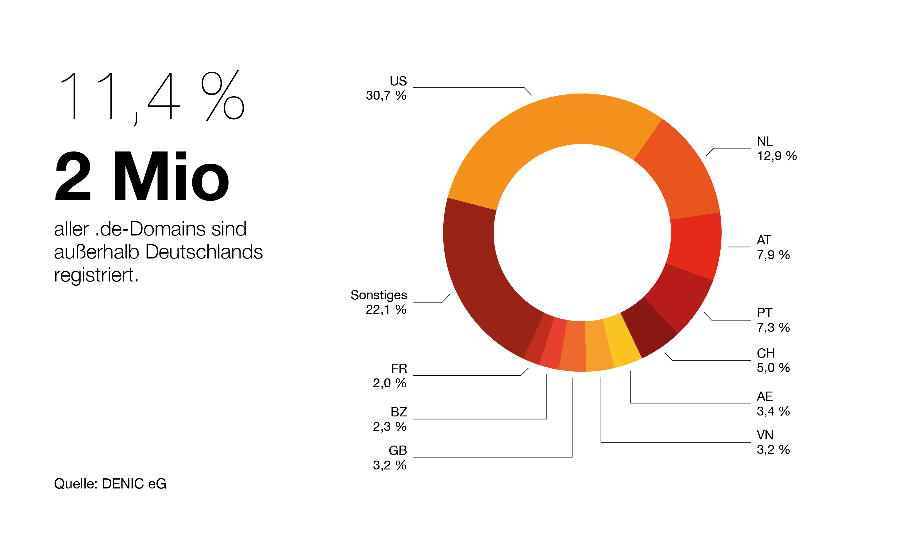 Die ausländischen Inhaber von .de-Domains stammen aus der ganzen Welt. Deutlich am stärksten nachgefragt sind deutsche Domains beständig in den USA (31 %) und den Niederlanden (13 %). Es folgen unverändert Österreich (8 %), Portugal (7 %) und die Schweiz (5 %). Die Vereinigten Arabischen Emirate sowie Großbritannien mit je 3 Prozent und Frankreich (2 %) gehören ebenfalls zu den Top 10, die zusammen mehr als drei Viertel des Domainbestands ausländischer Inhaber beinhalten. Besonders häufig wir de. im EU-Raum gewählt, wo die Hälfte, der in den Top 10 verzeichneten Domaininhaber beheimatet sind.
