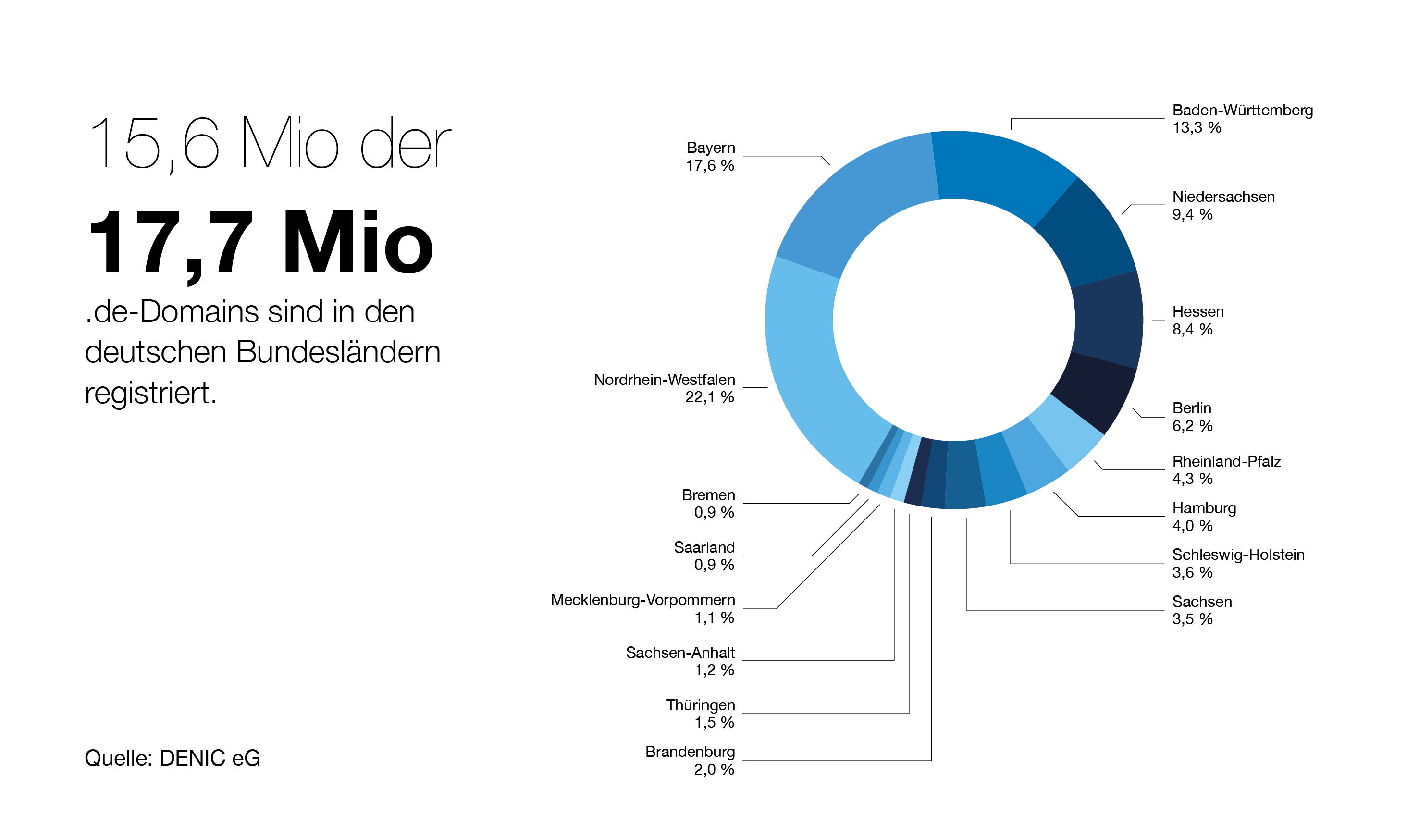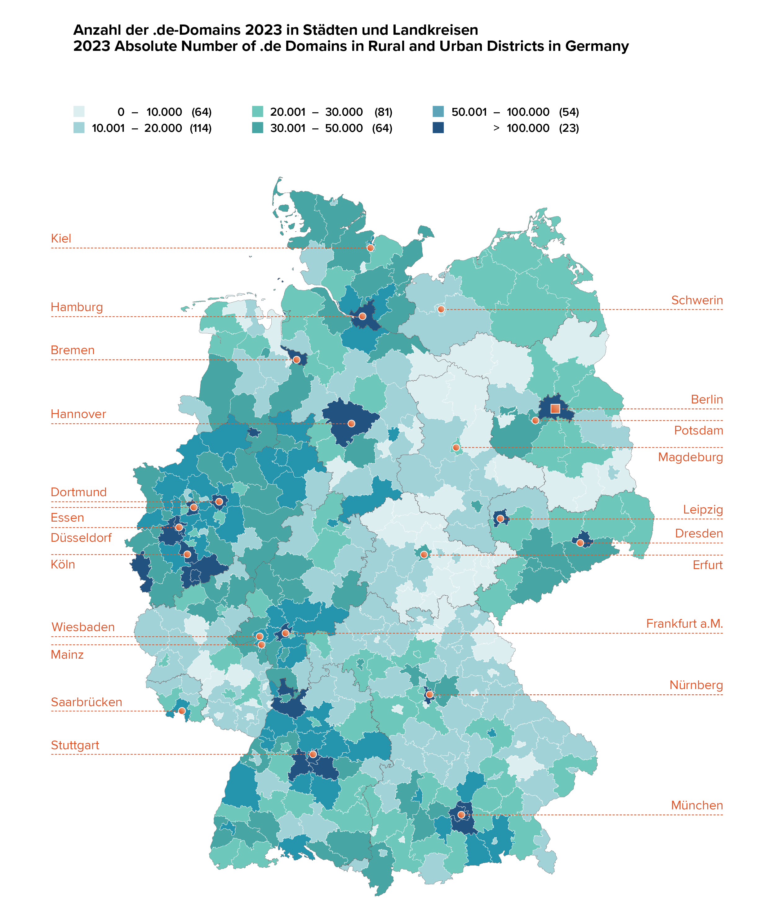 Per 31.12.2023 sind in den 400 deutschen Städten und Kreisen 15,6 Millionen Domains verzeichnet. Hinzu kommen über 2 Millionen Registrierungen durch Inhaber mit Wohnsitz im Ausland. Insgesamt waren zum Jahresabschluss 2023 bei DENIC 17.654.263 Domains registriert. In Summe wuchs der .de-Bestand binnen eines Jahres um 230.000, die Anzahl der in deutschen Städten und Kreisen verzeichneten .de-Domains stieg um rund 65.000. Statistisch betrachtet entfällt auf jeden fünften Einwohner der Bundesrepublik eine .de-Domain.
